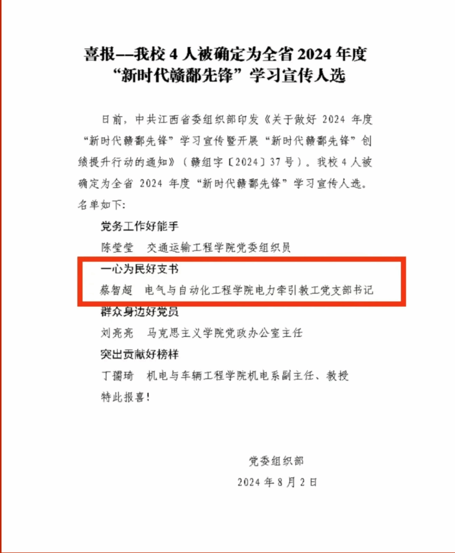 喜报 | 我院电力牵引教工党支部书记蔡智超被确定为全省2024年度“新时代赣鄱先锋”学习宣传人选