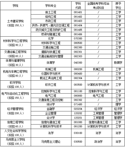 2.前置专业要求:①土建学院:招收与土木建筑学院现有专业相关的学生;②机电学院:学员专业背景或现在所从事的专业工作为机械类、车辆类、仪器仪表类、交通运输工程专业(只限于载运工具、机械、车辆类专业背景),不接收文科类专业背景;③电气学院:学员专业背景或所从事的工作为电类、信息与控制类、计算机或软件类专业;④经管学院:各硕士点要求前置学位为理工科或经济管理类学士学位;⑤交通学院:道路与铁道工程前置专业要求为交通运输工程、土木工程、力学、计算机科学与技术、控制科学与工程、信息与通信工程等;交通运输规划与管理前置专业要求为交通运输工程、管理科学与工程、计算机科学与技术、控制科学与工程、信息与通信工程等。