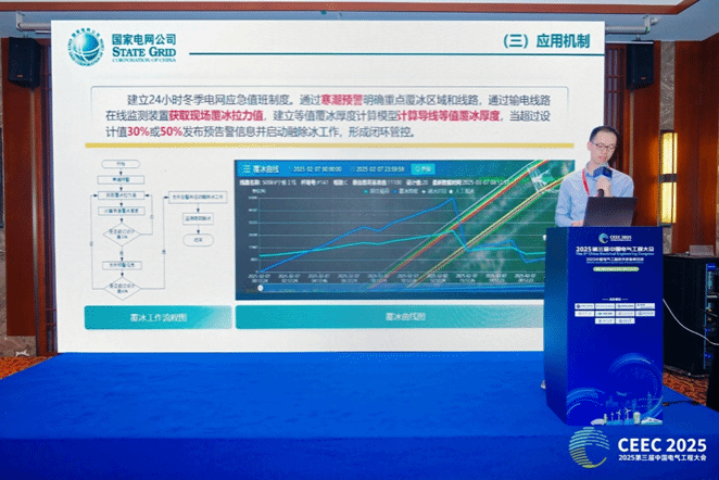 国网四川省电力公司电力科学研究院刘益岑高级工程师作了题为《四川电网覆冰监测及融除冰技术》的报告,指出“四川高海拔山区微地形微气候条件导致输电线路覆冰监测困难,传统观冰方式存在精度低、响应慢等问题。基于拉力传感器的覆冰在线监测系统,通过建立覆冰拉力变化率与等值覆冰厚度的无量纲换算模型,实现了覆冰厚度误差小于2毫米的高精度监测,并依托北斗短报文通信实现无信号区覆盖。该技术结合直流融冰装置与多型除冰机器人,形成“监测-预警-处置”闭环管控体系,为复杂地形下电网覆冰灾害的精准感知与高效处置提供了系统性技术支撑。