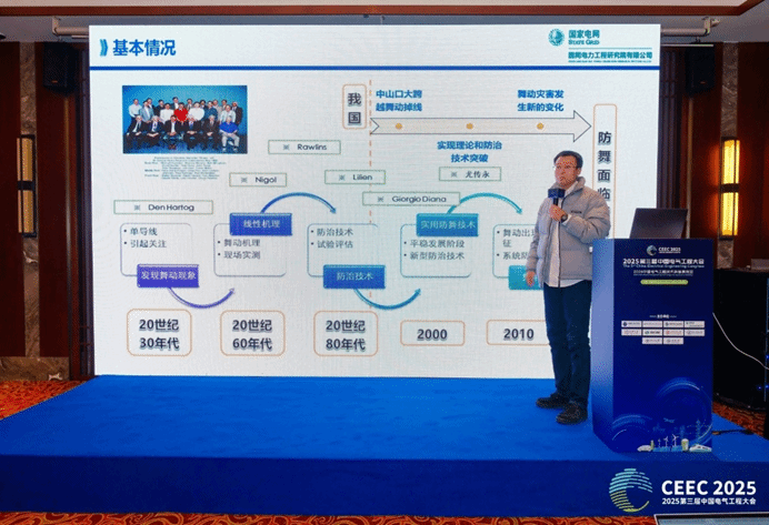 国网电力工程研究院有限公司刘彬教授级高工作了题为《架空导线覆冰舞动研究进展》的报告,指出“覆冰导线在风载作用下引发的低频大振幅舞动是威胁电网安全运行的重要致灾因素,其本质为气动负阻尼导致的非线性失稳振动。提出了以“改变气动载荷、覆冰条件与结构参数”为核心的防舞技术体系,研发并应用了扰流防舞器、相间间隔棒、双摆防舞器等多类防舞装置,有效抑制了导线舞动幅度与能量积聚。面对极端气候频发的新常态,研究进一步强调应构建涵盖智能感知、风险评估与综合防护的覆冰舞动韧性提升体系,为电网在复杂气象条件下的防灾设计与运行维护提供了系统性技术支撑。