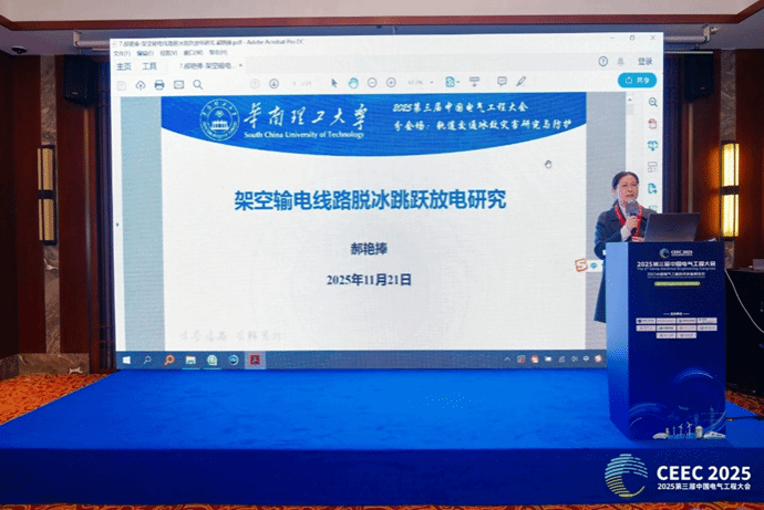 华南理工大学电力学院郝艳捧教授作了题为《架空输电线路脱冰跳跃放电预警研究》的报告,指出“输电线路覆冰脱落引发的跳跃放电是导致高海拔山区线路故障的关键诱因,其动态放电过程受覆冰类型、微气象条件与线路参数多重影响。基于多源监测数据构建了脱冰概率的Copula联合分布模型,揭示了温升融冰、低温脆化与风振三类典型脱冰模式;搭建110kV导地线脱冰跳跃放电试验平台,系统分析了不同覆冰状态下最大放电距离与电流特性的变化规律,并提出基于布里渊频移分析的分布式光纤监测方法,实现脱冰放电过程的温升定位与动态响应捕获,为构建“脱冰时机-跳跃幅度-放电风险”三级预警机制与提升输电线路在覆冰条件下的绝缘配合可靠性提供了理论与技术依据。