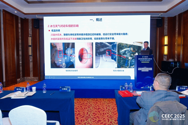 中车长春轨道客车股份有限公司电气开发部韩伟副部长作了题为《国内外铁路应对冰雪灾害技术的研究进展》的报告,指出“高寒动车组在冰雪环境下面临弓网受流、走行部冻结及密封失效等关键技术挑战,需从材料低温适应性、结构防雪密封及电气部件防护等多维度提升整车抗冰雪能力。总结了我国高寒动车组在转向架防击打、受电弓风管防护、牵引系统绝缘灌封等方面的技术改进措施,并借鉴俄罗斯丙二醇预喷洒与日本专用除冰受电弓等国际经验,提出了融合结构优化、智能监测与主动防护的整车系统防冰策略,为提升我国高寒动车组在极端冰雪条件下的运行安全性与运维适应性提供了技术支撑。