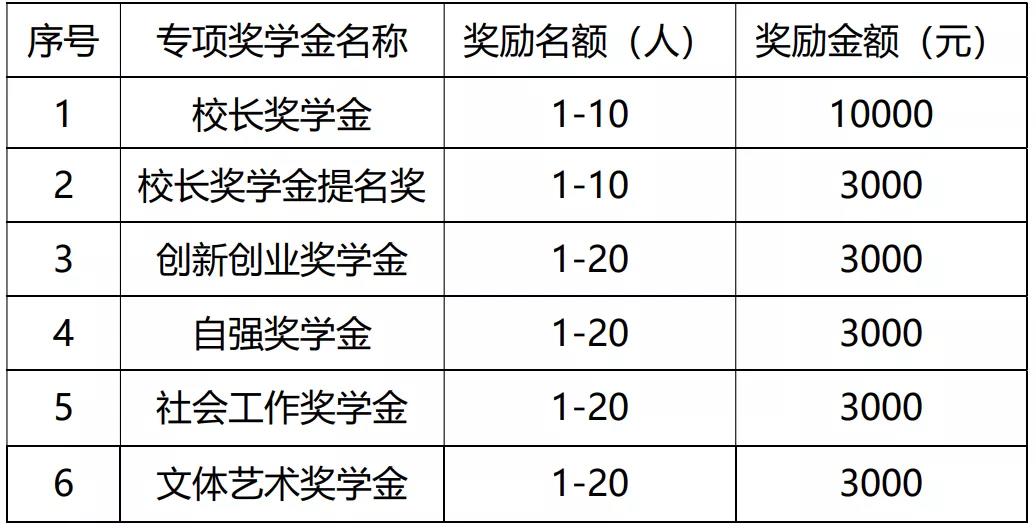 专项奖学金是由学校出资设立,用以激励学生培养创新精神和个性化发展。具体分为:校长奖学金、校长奖学金提名奖、创新创业奖学金、自强奖学金、社会工作奖学金和文体艺术奖学金。采取个人申报、学院推荐、学校审核答辩的方式予以评定。