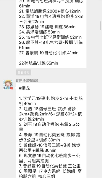 我院全体学生纷纷响应,“云锻炼”阵容不断扩大,锻炼方式层出不穷,有跑步、哑铃卧推、引体向上等毅力锻炼,有健腹轮、深蹲、平板撑等专项训练,有篮球、羽毛球、乒乓球等休闲娱乐,更有闲暇时打太极等修身养性的锻炼。每一位同学都在按时完成自己设立的目标,班群内皆是同学们分享的运动内容和心得体会。
