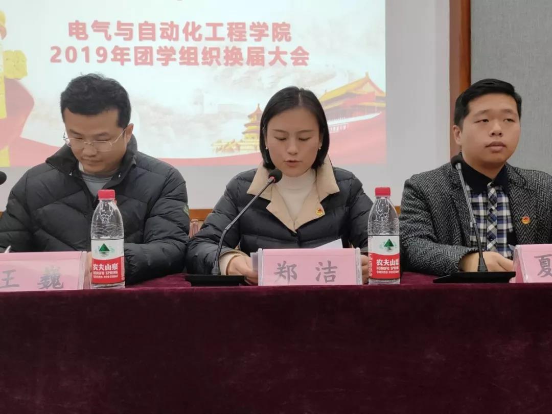 12月1日,我院于电气楼举办团学组织换届大会。院党委副书记王巍、学工办主任兼团委书记郑洁、学工办辅导员夏圣伟、魏建萍及2018-2019学年各团学组织学生干部代表和2019-2020学年各团学组织全体成员参加本次会议。