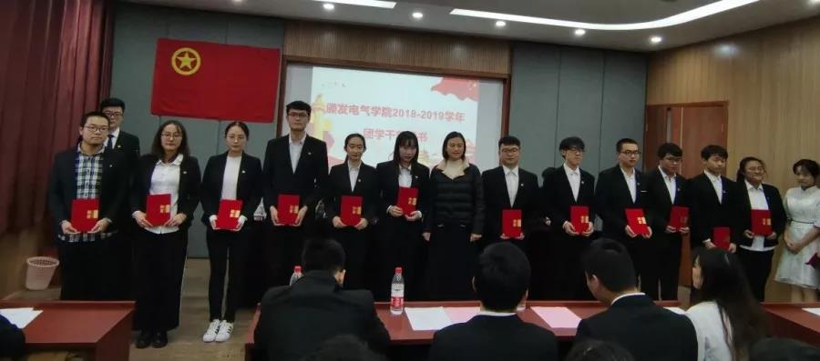 电气学院党委副书记王巍老师为电气学院2018-2019学年各团学组织负责人颁发聘书并合影留念;