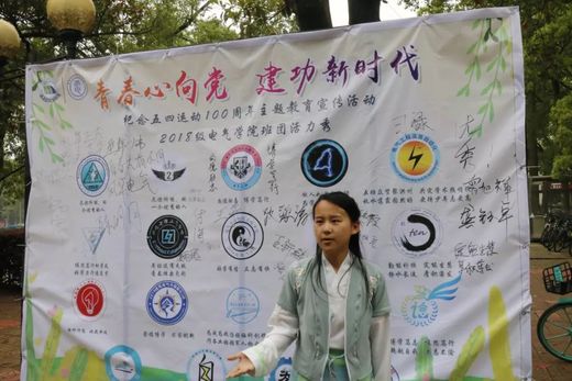 时间的主线来到时代的前沿,来自电气一班的平易容站在挂满班级徽章、写满班级口号的展板前,代表参加本次活动的所有班级和同学,带来以“童话破碎伊始”为题的“百年五四”演讲: