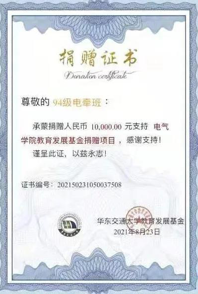 近日,1994级电牵班校友向学院捐赠了人民币10000元,以支持“0638太阳集团教育发展基金捐赠项目”。
