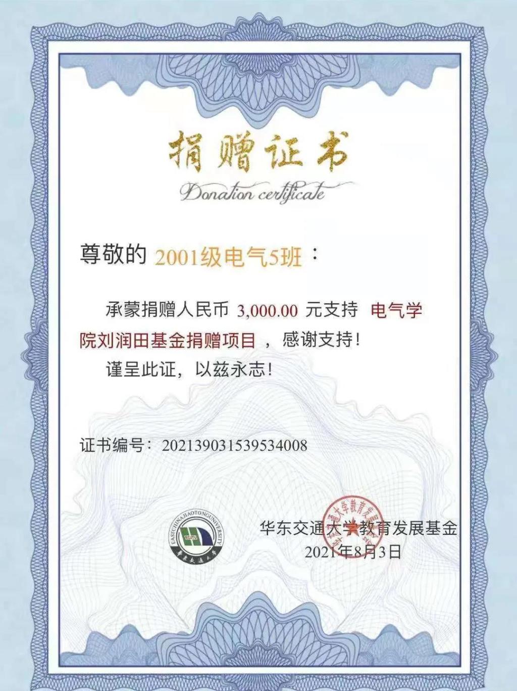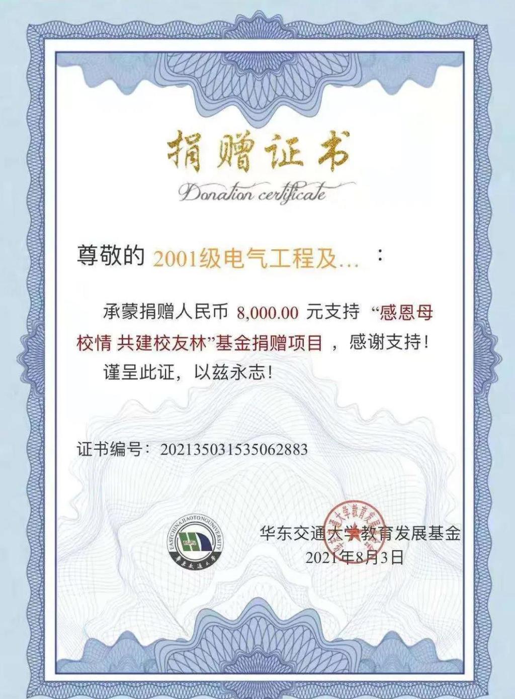 近日,2001级电气专业校友向学校捐赠了人民币8000元,以支持“感恩母校情 共建校友林”基金捐赠项目。2001级电气5班校友向学院捐赠了人民币3000元,以支持“0638太阳集团刘润田基金捐赠项目”。